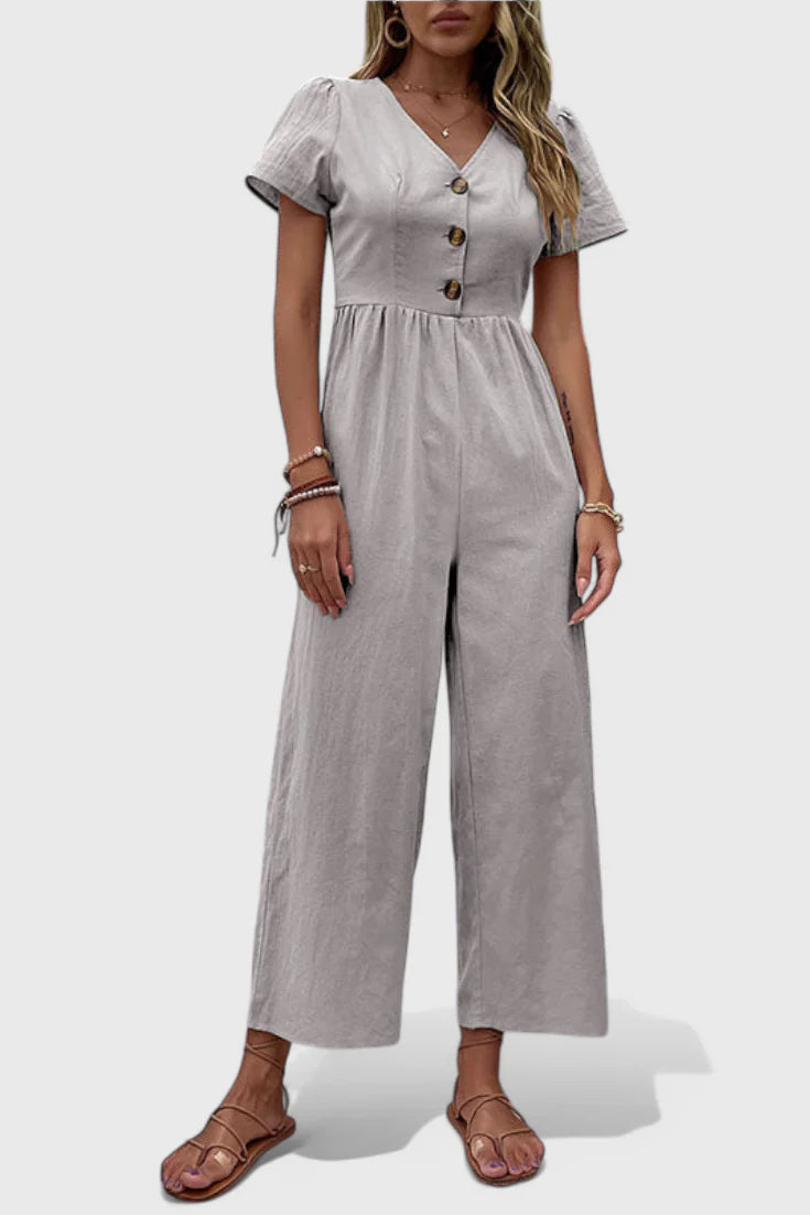 Adopta el arte de la elegancia desenfadada con Camila: un mono de manga corta diseñado para la comodidad y el impacto. Confeccionado con tejido de primera calidad, su silueta de pierna ancha y su acabado con botones en el frente aportan estructura a tu guardarropa de clima cálido. Una prenda relajada pero pulida para días soleados y noches casuales.