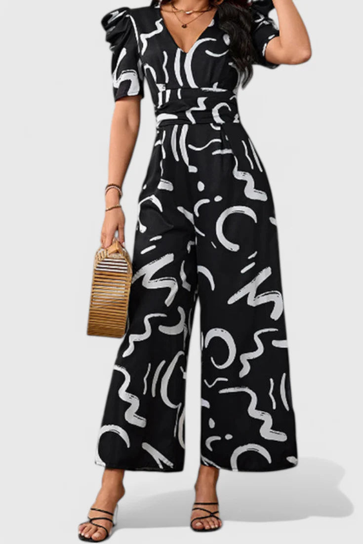 Llama la atención con Zawadi, un mono destacado que combina un estampado audaz con un corte esculpido. Con un escote en V afilado, elegantes mangas abullonadas y una silueta de pierna ancha, es una elección segura tanto para días refinados como para noches elegantes.