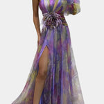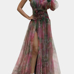 Una declaración de estilo para eventos que exigen presencia. El vestido Amelie combina un diseño escultural con detalles etéreos, desde su escote asimétrico hasta la falda drapeada con abertura frontal. El estampado acuarelado y el aplique floral en la cintura elevan su elegancia, creando una silueta inolvidable para celebraciones sofisticadas.