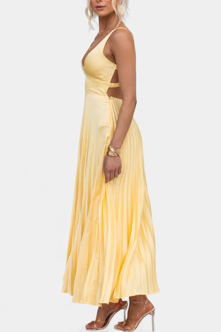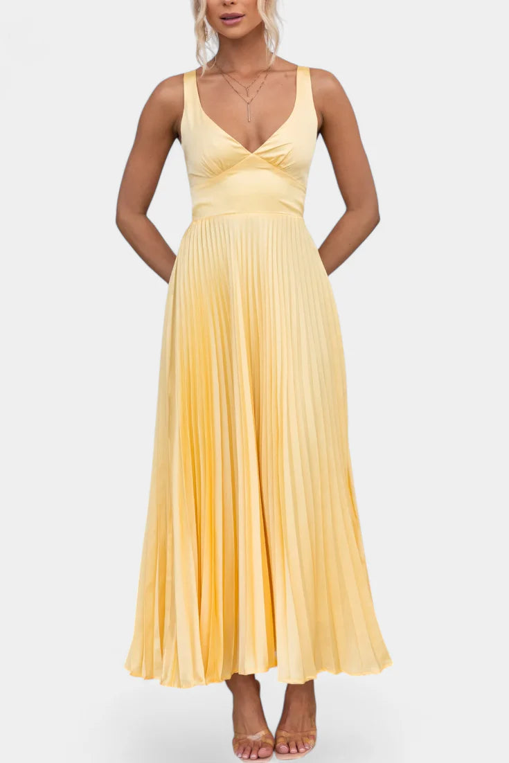 Radiante y femenino, el vestido Arlena deslumbra con su silueta plisada, escote en V y espalda cruzada descubierta. Diseñado para quienes buscan fluidez, elegancia y ligereza, es perfecto para eventos soleados, celebraciones al aire libre o noches de verano con encanto.