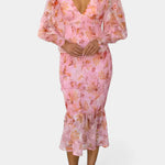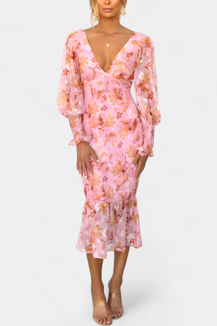 Carly Vestido Midi Floral con Cintura Fruncida y Mangas Vaporosas