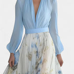 Elegancia etérea con un toque artístico y moderno. El vestido Eliane combina una parte superior fluida con escote en V profundo y mangas vaporosas, con una falda larga decorada en un delicado estampado floral tipo acuarela. Su movimiento envolvente y silueta refinada lo convierten en una pieza protagonista para brillar con naturalidad.