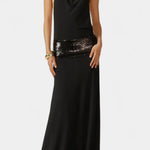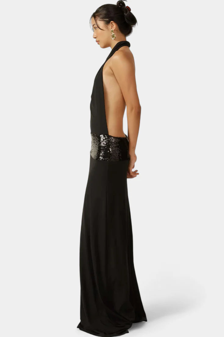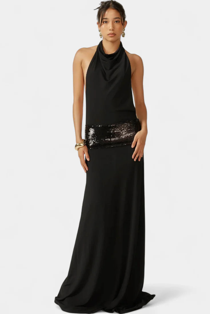 Con un brillo sutil y una silueta cautivadora, el vestido Georgia está hecho para destacar en cada evento elegante. Su escote drapeado halter y la espalda completamente descubierta ofrecen un equilibrio perfecto entre sofisticación y sensualidad, mientras que la banda de lentejuelas aporta un toque de lujo refinado.