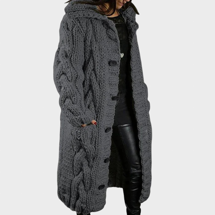 El Karina elegante abrigo acogedor te envuelve en calidez, textura y estilo atemporal. Confeccionado con una suave y transpirable mezcla de punto, presenta un diseño de trenza oversize que aporta tanto comodidad como carácter. Su silueta de largo completo ofrece una suave cobertura abdominal y una caída elegante, mientras que la capucha y los bolsillos laterales añaden un toque de elegancia práctica. Ya sea para un paseo relajado o un encuentro con amigos, Karina te mantiene con estilo, abrigada y con una refinada naturalidad.