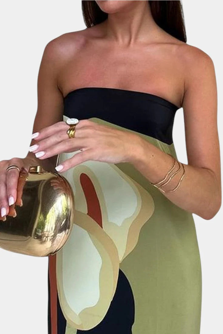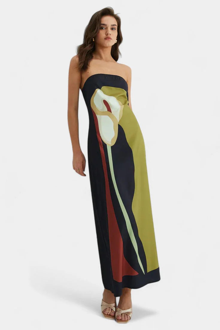 Adéntrate en la simplicidad elevada con el Vestido Laura, donde el arte moderno se encuentra con la elegancia fluida. Con un escote sin tirantes y audaces flores abstractas, esta silueta maxi aporta sofisticación sin esfuerzo a los días soleados y noches elegantes.