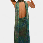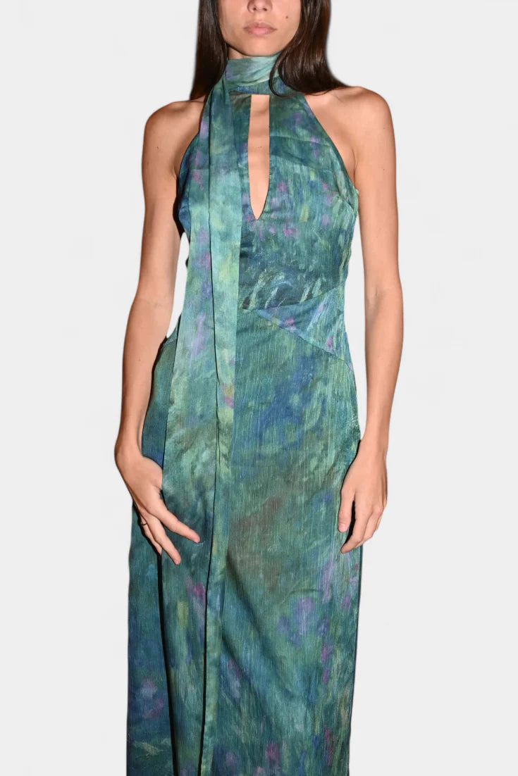 Inspirado en la paleta onírica de los jardines de Monet, el vestido Moana captura la belleza del impresionismo con cada detalle. Su caída ligera en chiffon premium, el cuello alto con abertura lágrima y la espalda cuadrada abierta evocan un romanticismo moderno. La bufanda separada añade un gesto de distinción, perfecto para ocasiones que merecen ser recordadas.