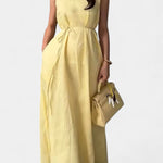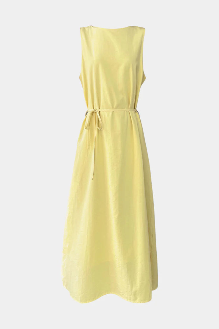 Frescura natural y elegancia sencilla definen al vestido Rosetta. Con una caída ligera y un diseño sin mangas con cuello redondo, este vestido tipo A ofrece un ajuste cómodo y favorecedor. El lazo fino en la cintura añade un toque sutil y relajado, ideal para los días cálidos y la sencillez con estilo.